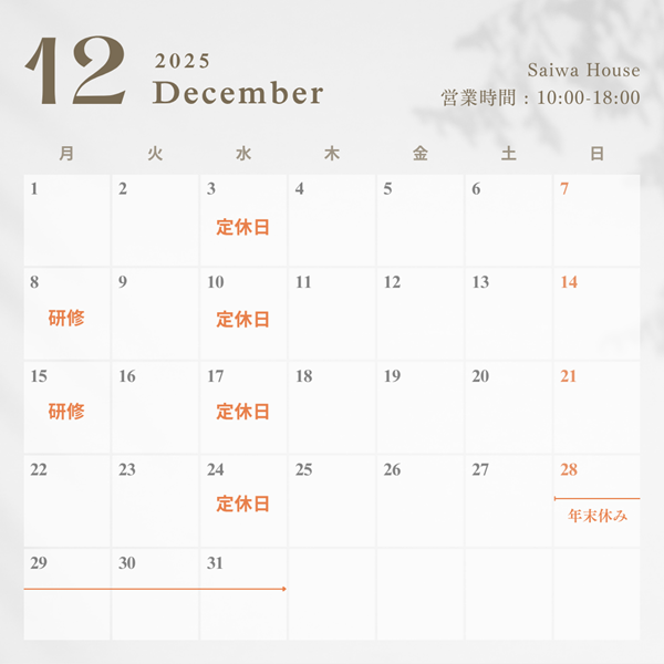 12月 定休日のお知らせです