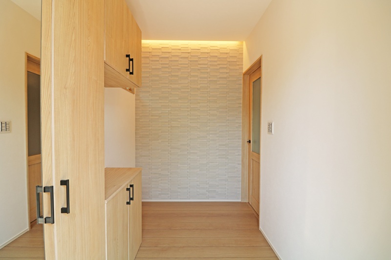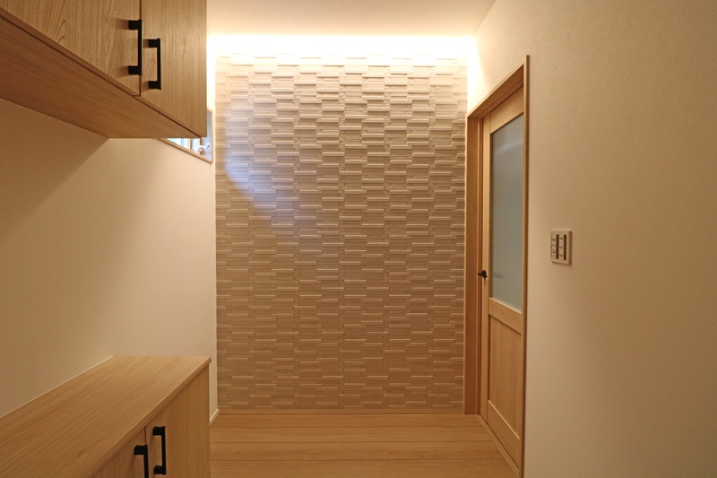 玄関を入ると柔らかい光の間接照明とエコカラットがY様ファミリーをお出迎え♪